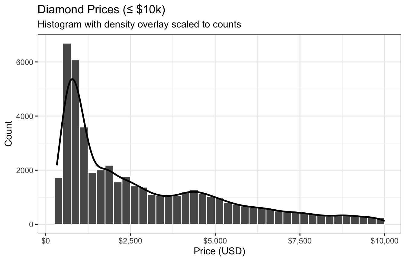 (restrict to $10,000 or less for visibility), overlay a scaled density curve so both share a…