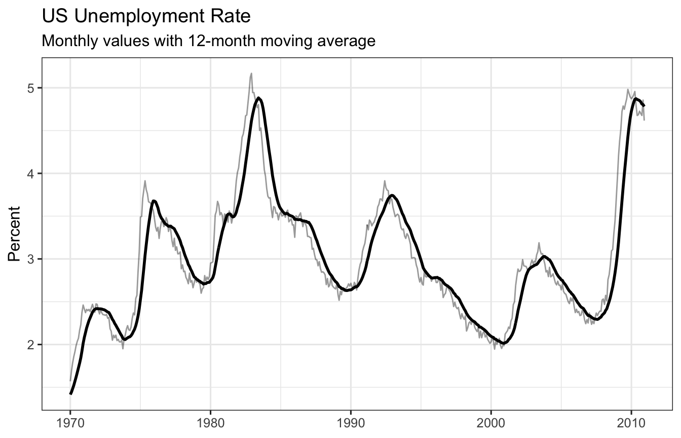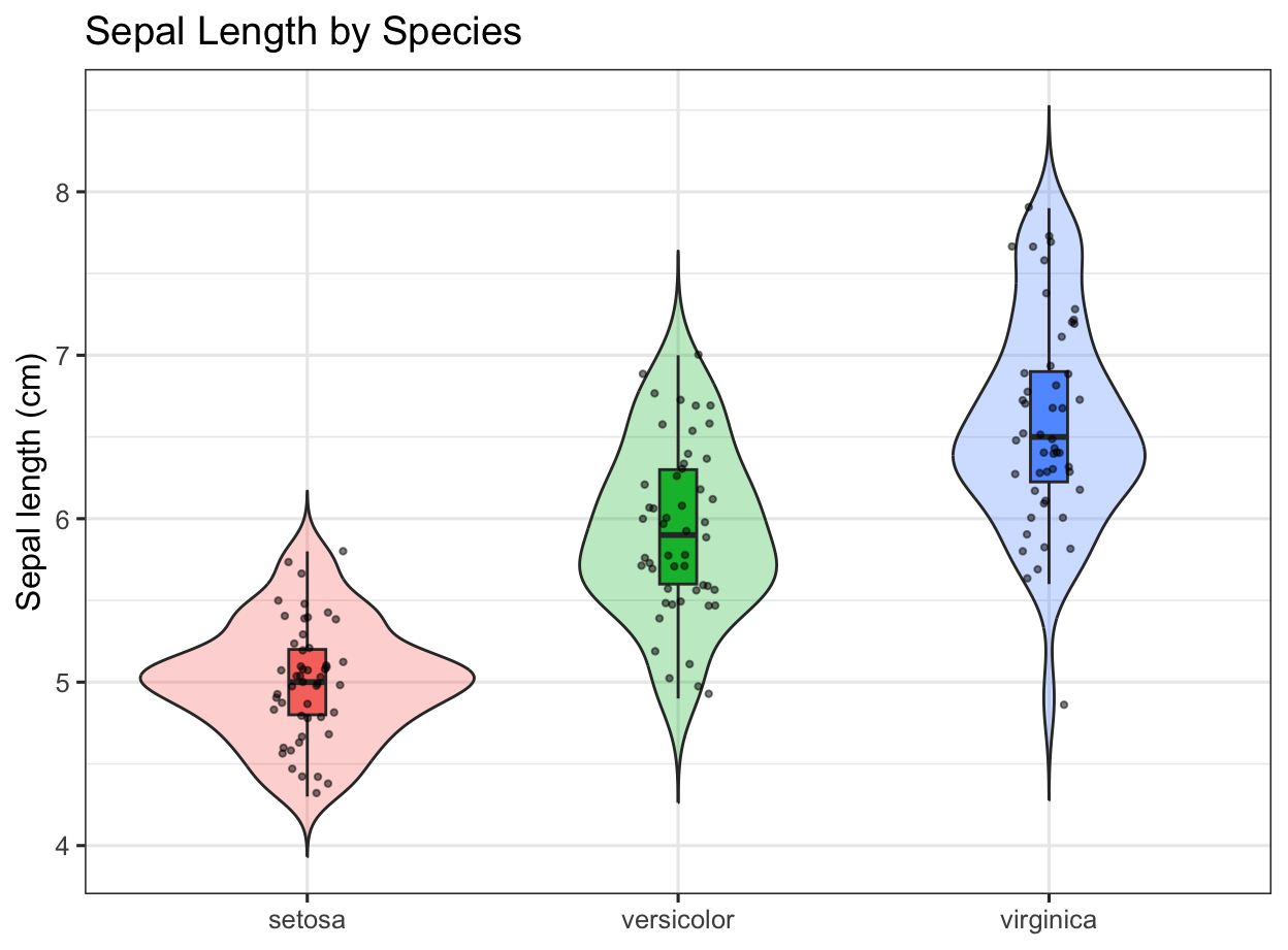---title: "Data Visualization"subtitle: "How to Make Dynamic Figures"author: "08-Data Visualization"format: html: toc: true toc-depth: 2 code-fold: true code-tools: true code-summary: "Show answer" df-print: pagedparams: show_answers: true # Set to false to hide all answer code but still render figuresexecute: freeze: auto echo: true warning: false message: false---::: callout-tip## How to render with/without answers- **With answers (default)**: `quarto render viz-handout.qmd`- **Without answers** (figures only): `quarto render viz-handout.qmd -P show_answers:false`:::```{r}#| label: setup#| include: false#| echo: false# Load packages and set a default themesuppressPackageStartupMessages({library(tidyverse)})set.seed(123)theme_set(theme_bw(base_size =12))```# 1) Distribution: Histogram + Density Overlay (Diamonds)You are given `ggplot2::diamonds` (>50k rows). Create a histogram of **price** (restrict to \$10,000 or less for visibility), overlay a scaled density curve so both share a comparable y-scale, and style axes and labels.**Requirements**- Filter to `price <= 10000`.- Histogram with a **binwidth of 250**.- Overlay a **density** where `y = after_stat(count) * 250` so peaks align with histogram counts.- Label axes and apply a dollar formatter to x-axis.- Use `theme_bw()` and a concise title/subtitle.```{r}#| label: fig-diamonds-price#| fig-cap: "Histogram and scaled density of diamond prices (≤ $10k)."#| echo: !expr params$show_answers#| code-summary: "Show answer code"#| fig-width: 7#| fig-height: 4.5library(ggplot2)p1 <- diamonds |>filter(price <=10000) |>ggplot(aes(price)) +geom_histogram(binwidth =250, boundary =0, closed ="left", color ="white") +geom_density(aes(y =after_stat(count) *250), linewidth =1, alpha =0.15, fill =NA) +scale_x_continuous(labels = scales::dollar_format(accuracy =1)) +labs(title ="Diamond Prices (≤ $10k)",subtitle ="Histogram with density overlay scaled to counts",x ="Price (USD)", y ="Count" ) +theme(legend.position ="none")p1```---# 1.1) Make the above graph better --- # 2) Bivariate: Scatter with LOESS Trend + Facets (MPG)Using `ggplot2::mpg`, visualize **highway mileage (hwy)** vs **engine displacement (displ)**, colored by **class**. Add a LOESS smooth and facet by **drive (drv)**.**Requirements**- `geom_point(alpha = 0.6)` and `geom_smooth(se = FALSE, method = "loess")`.- Axis limits: `y` from 10 to 45.- Facet by `drv` with `facet_wrap(~ drv, nrow = 1)`.- Place legend at the bottom.```{r}#| label: fig-mpg-scatter#| fig-cap: "Highway MPG vs. engine displacement, colored by class, faceted by drive (mpg)."#| echo: !expr params$show_answers#| code-summary: "Show answer code"#| fig-width: 7#| fig-height: 4.8mpg |>ggplot(aes(displ, hwy, color = class)) +geom_point(alpha =0.6) +geom_smooth(se =FALSE, method ="loess") +scale_y_continuous(limits =c(10, 45), breaks =seq(10, 45, 5)) +labs(title ="Fuel Economy by Engine Size",subtitle ="LOESS trends by vehicle class",x ="Engine displacement (L)", y ="Highway MPG" ) +facet_wrap(~ drv, nrow =1) +theme(legend.position ="bottom")```---# 2.1) Make the above graph better --- # 3) Small Multiples: Facet Wrap by Class (MPG)Produce small multiples of **hwy vs displ** but facet by **class** to compare patterns across vehicle classes.**Requirements**- Same base mapping as above; facet by `class` (`ncol = 4`).- Use a consistent y-scale.- Add a translucent linear fit per panel (`method = "lm"`).```{r}#| label: fig-mpg-facets#| fig-cap: "Small multiples of hwy vs displ by vehicle class (linear fits)."#| echo: !expr params$show_answers#| code-summary: "Show answer code"#| fig-width: 8#| fig-height: 7mpg |>ggplot(aes(displ, hwy)) +geom_point(alpha =0.6, color ="grey30") +geom_smooth(method ="lm", se =FALSE, linewidth =0.8, alpha =0.9) +scale_y_continuous(limits =c(10, 45), breaks =seq(10, 45, 5)) +labs(title ="Fuel Economy vs Engine Size by Vehicle Class",x ="Engine displacement (L)", y ="Highway MPG" ) +facet_wrap(~ class, ncol =4)```---# 3.1) Make the above graph better --- # 4) Time Series: Unemployment Rate with 12-Month Moving Average (economics)Using `ggplot2::economics`, compute the **unemployment rate** as `100 * unemploy / pop`. Plot the monthly rate and a 12-month moving average.**Requirements**- Create `urate = 100 * unemploy / pop`.- Compute a 12-month moving average using `stats::filter`.- Plot `urate` as a faint line and overlay the moving average as a thicker line.- Limit the x-axis to 1970–2010 for focus.```{r}#| label: fig-economics-ma#| fig-cap: "US unemployment rate with 12-month moving average (1970–2010)."#| echo: !expr params$show_answers#| code-summary: "Show answer code"#| fig-width: 7#| fig-height: 4.5library(stats)economics |>mutate(urate =100* unemploy / pop,ma12 =as.numeric(stats::filter(urate, rep(1/12, 12), sides =1)) ) |>filter(date >=as.Date("1970-01-01"), date <=as.Date("2010-12-31")) |>ggplot(aes(date, urate)) +geom_line(alpha =0.4) +geom_line(aes(y = ma12), linewidth =1) +labs(title ="US Unemployment Rate",subtitle ="Monthly values with 12-month moving average",x =NULL, y ="Percent" )```---# 5) Distribution by Group: Violin + Box + Jitter (iris)Using `datasets::iris`, compare **Sepal.Length** by **Species** with violins, embedded boxplots, and jittered points. Reorder species by median sepal length.**Requirements**- Reorder x-axis by median `Sepal.Length`.- Use `geom_violin(trim = FALSE, alpha = 0.3)` + `geom_boxplot(width = 0.1, outlier.shape = NA)`.- Add `geom_jitter(width = 0.1, alpha = 0.5, size = 0.8)`.- Hide the fill legend and label clearly.```{r}#| label: fig-iris-violin#| fig-cap: "Sepal length distributions by species (iris)."#| echo: !expr params$show_answers#| code-summary: "Show answer code"#| fig-width: 6.5#| fig-height: 4.8iris |>as_tibble() |>mutate(Species =fct_reorder(Species, Sepal.Length, .fun = median)) |>ggplot(aes(Species, Sepal.Length, fill = Species)) +geom_violin(trim =FALSE, alpha =0.3) +geom_boxplot(width =0.1, outlier.shape =NA) +geom_jitter(width =0.1, al