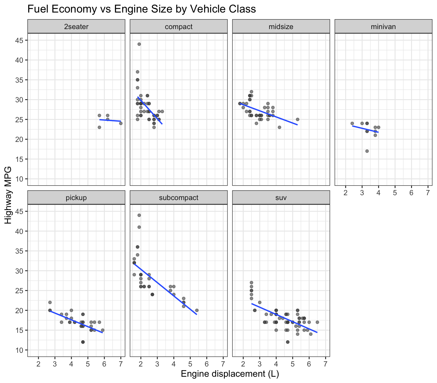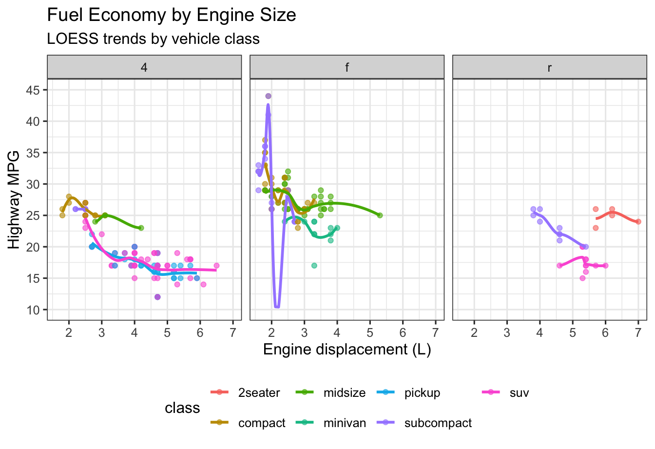 Using ggplot2::mpg, visualize highway mileage (hwy) vs engine displacement (displ), colored by class. Add a LOESS smooth and facet by drive (drv).