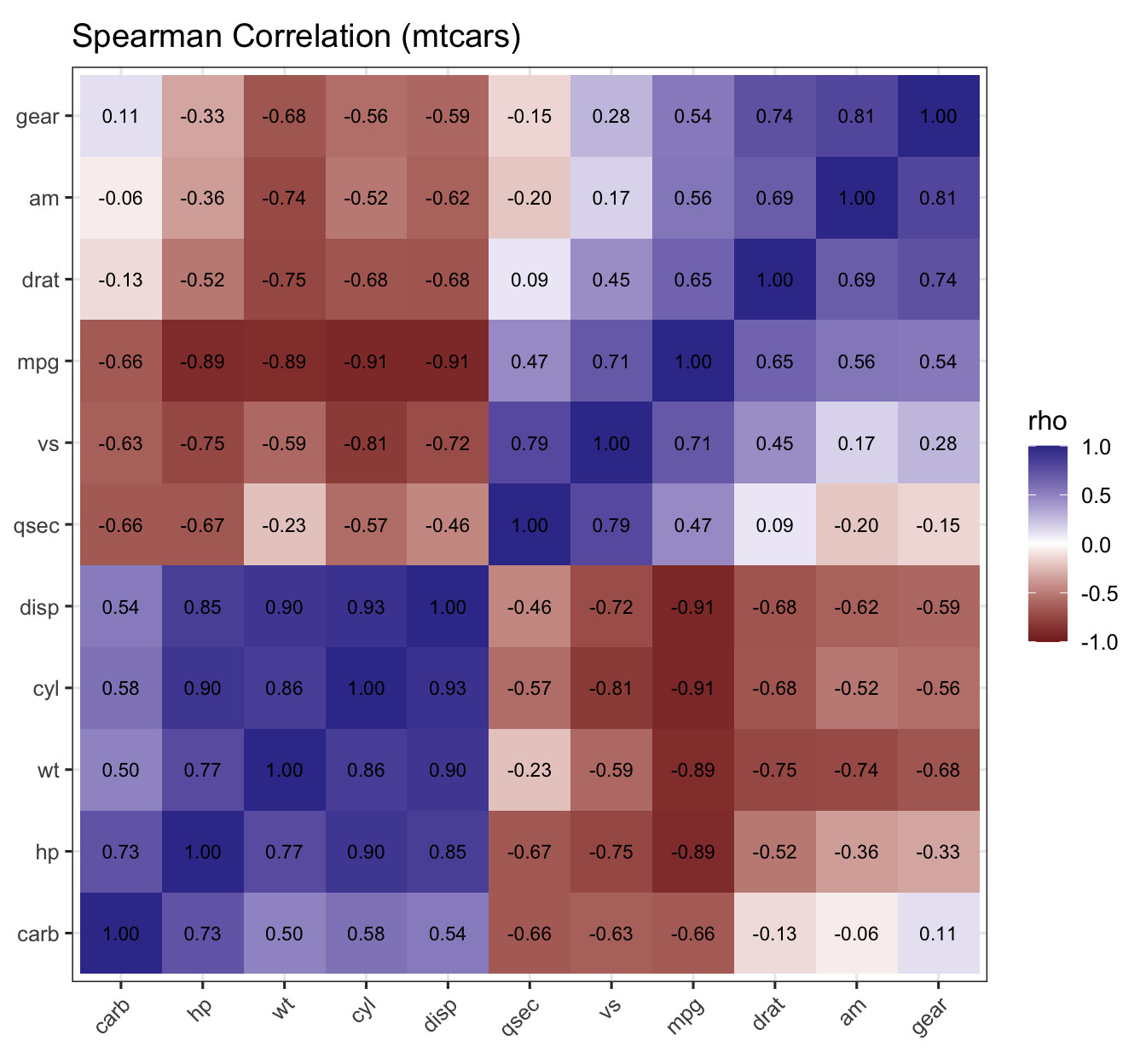 Figure 6: Spearman correlation heatmap with hierarchical clustering (mtcars).