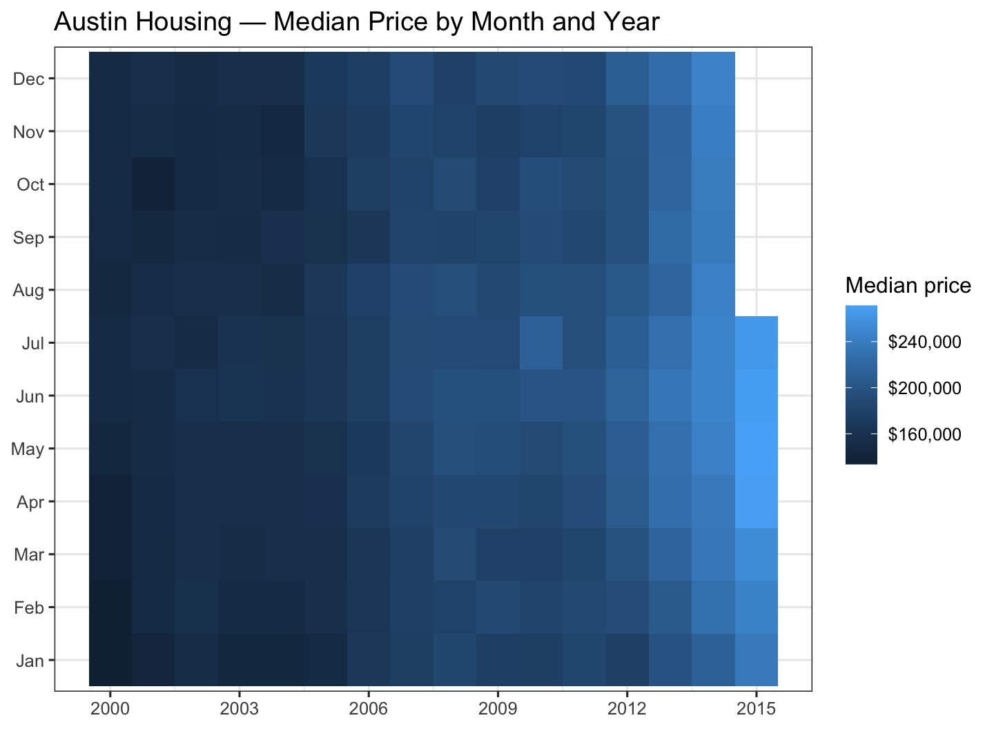 Figure 7: Median home price (Austin): month × year heatmap (txhousing).